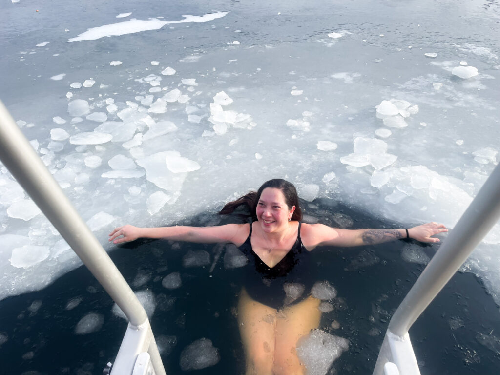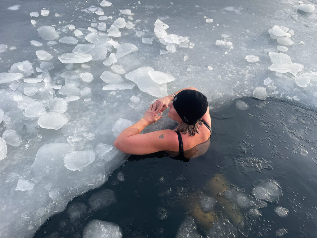 Solen titter fram bak skyene over Østraadt Havn og får isen til å glitre. Langs bryggekanten er det skåret ut et hull, der tre damer heier på hverandre og bytter på å klatre nedi.