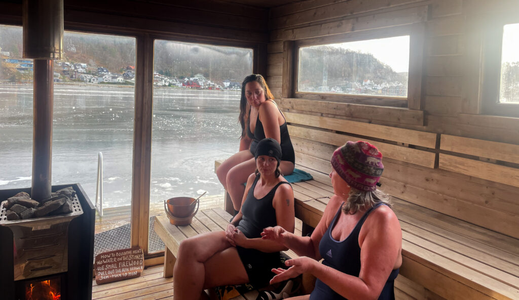 I saunaen prates det om alt fra hvem som er tøffest til isbading av menn og kvinner, til ferskvann versus saltvann. Og mellom lett drøs er det også rom for dypere samtaler om erfaringer, tanker og følelser.