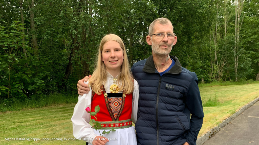 Signe og pappa under utdeling av vitnemål i 10.klasse juni 2024.